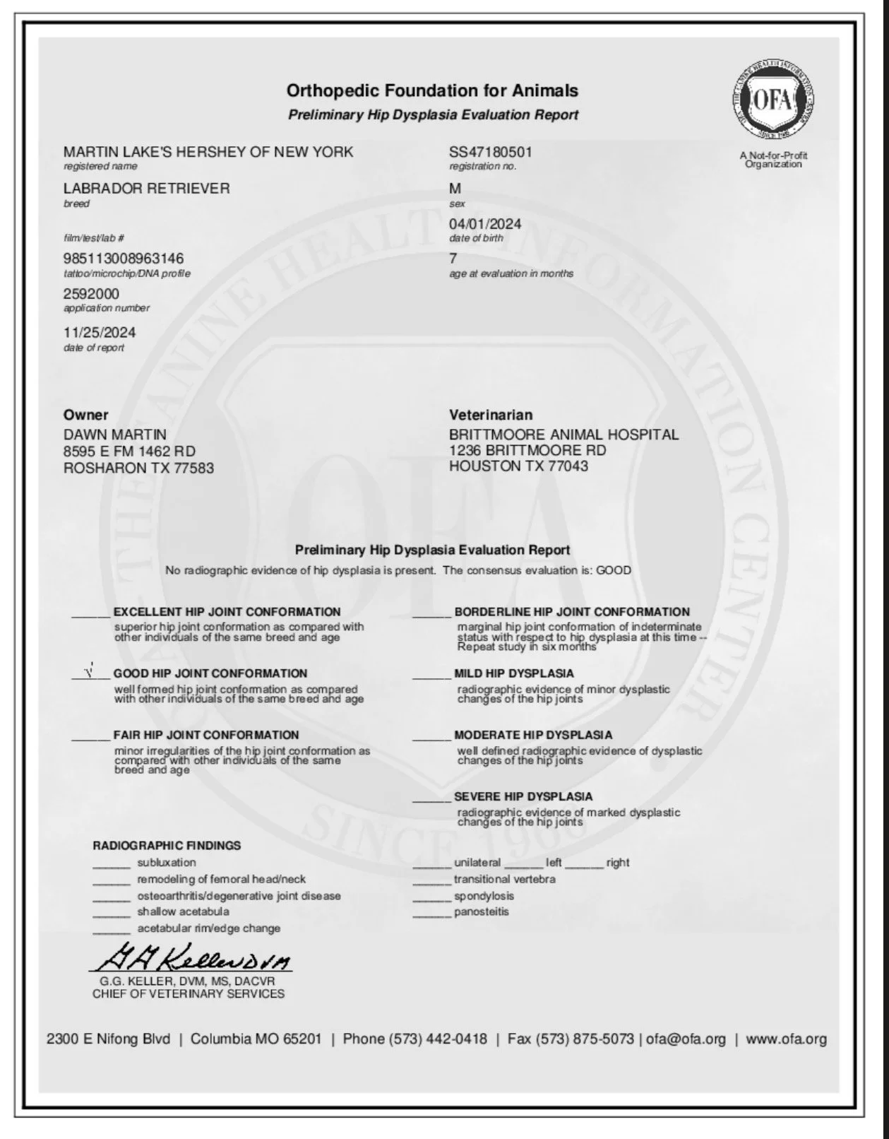 Embark Genetics: Skeletal Dysplasia: Clear, PRCD (Eyes): Clear, EIC (Exercise Collapse) Clear, HNPK (Nasal) Clear; ALT (Liver): Clear, Stargardt (Clear)